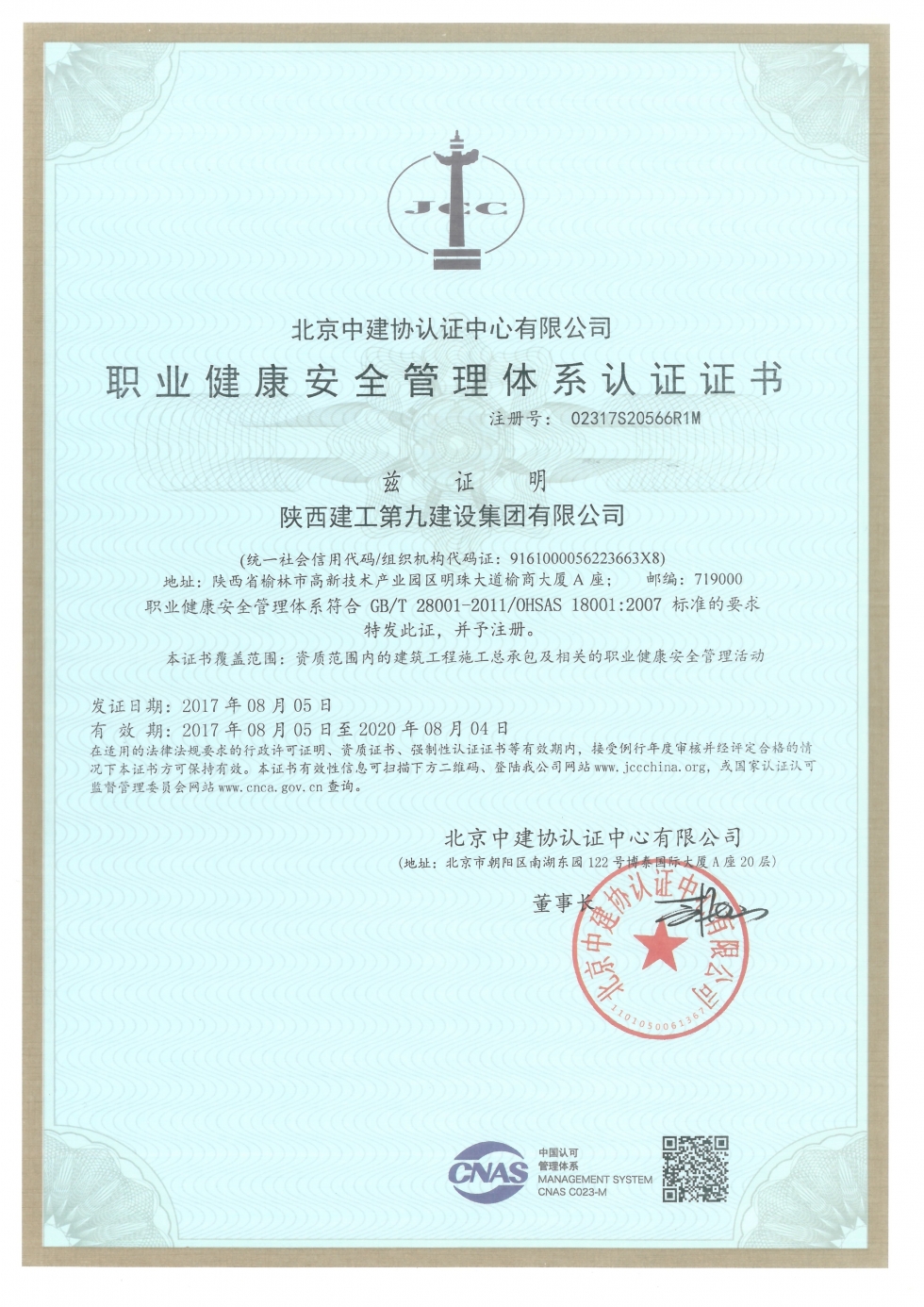 職業健康安全管理體係認證證書-集團資質-恩佐娱乐登陆-恩佐娱乐登陆